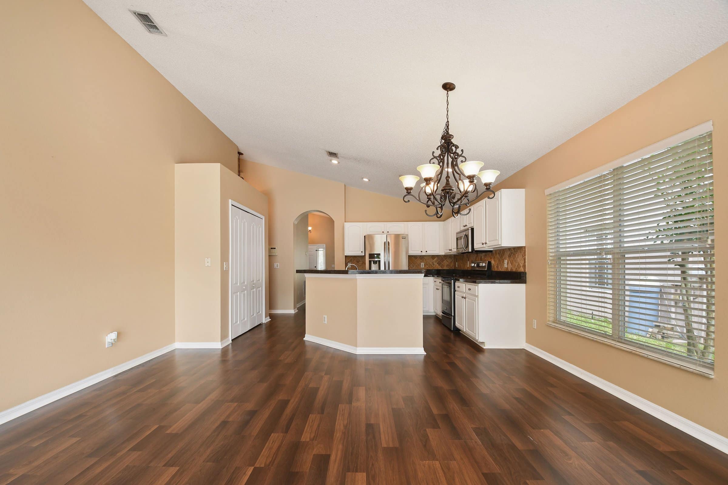Step through the front door of 887 Nonastone Run and into the combined living and dining spaces, perfectly suited for hosting family gatherings and holiday celebrations. Throughout these areas, you’ll immediately notice the tall vaulted ceilings, upgraded lighting fixtures, ceiling fans, and consistent dark laminate flooring. Moreover, the neutral color palette enhances the home’s bright and cohesive design. This open layout provides flexibility for entertaining, relaxing, or simply enjoying everyday living. Altogether, these spaces set the tone for a home that is both elegant and inviting.